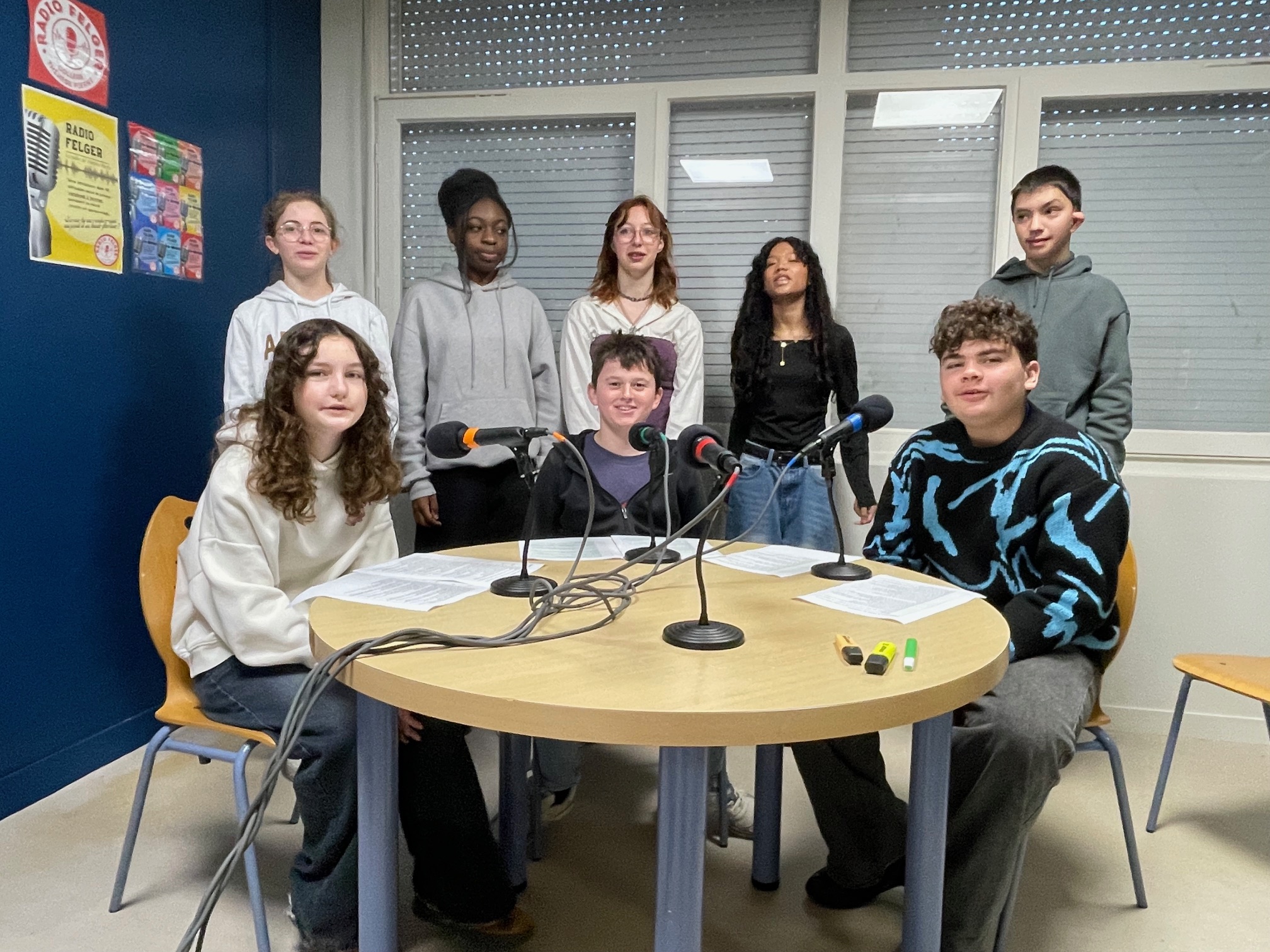 Le groupe de reporters dans le studio radio du collège |