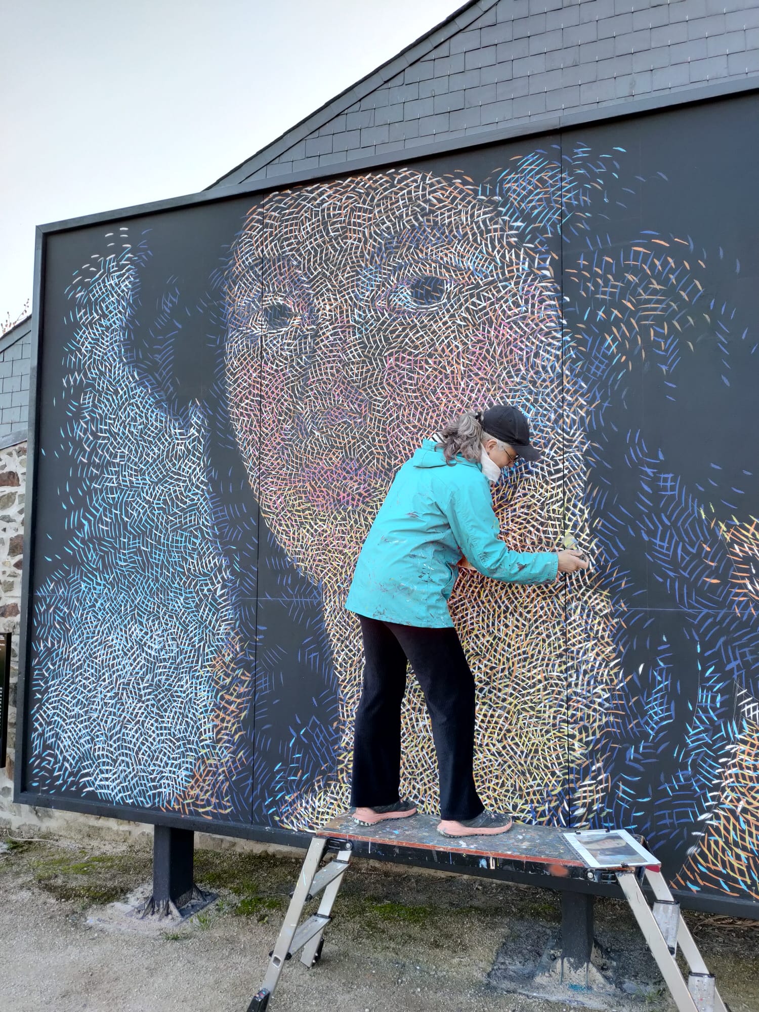 Nadège Dauvergne au travail sur la fresque des Urbanistes représentant Juliette Drouet |